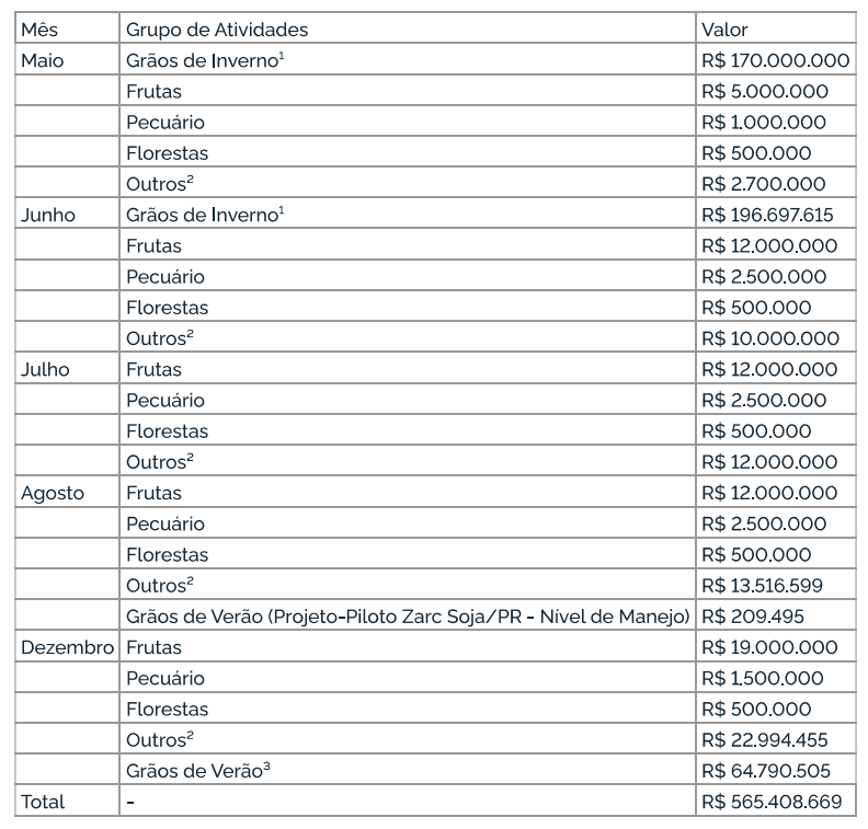 A norma publicada nesta quarta-feira, 17, modifica uma resolução de junho e totaliza o montante de R$ 565,4 milhões distribuídos ao PSR entre maio deste ano e dezembro. Houve alterações nos montantes destinados aos grupos. Por exemplo, havia previsão de R$ 80 milhões para grãos de inverno em julho. A resolução desta quarta reposicionou esses valores em outros grupos, como para os grãos de verão em dezembro.